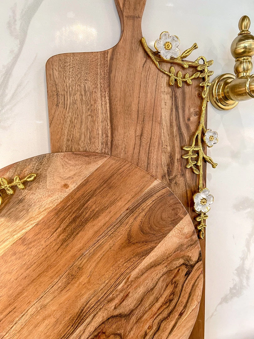 The Inspire Me! Charcuterie Board is absolutely stunning! The cherry blossom design adds a touch of elegance to my kitchen. The large size is perfect for hosting, and the handle makes it easy to carry. I love that it comes in two shapes, giving me versatility for different occasions. Highly recommend!