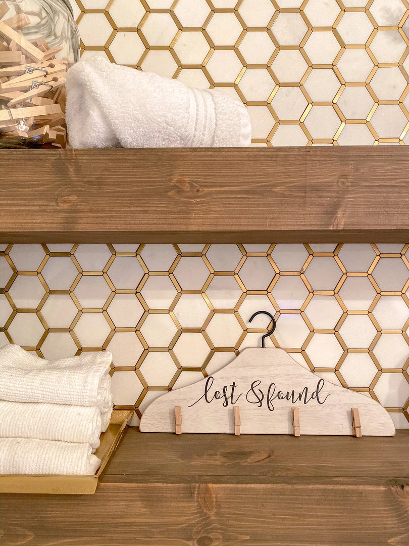 Description: This adorable lost and found sock hanger is perfect for your laundry room! We love the cute little clothes pins.