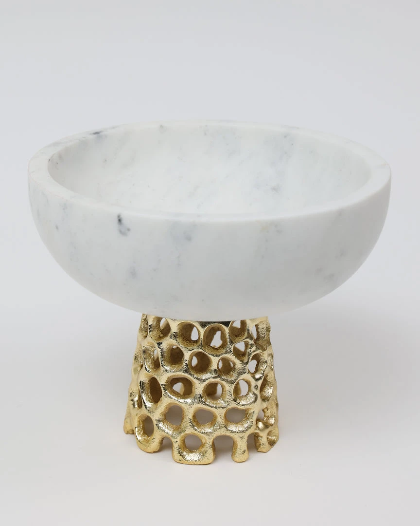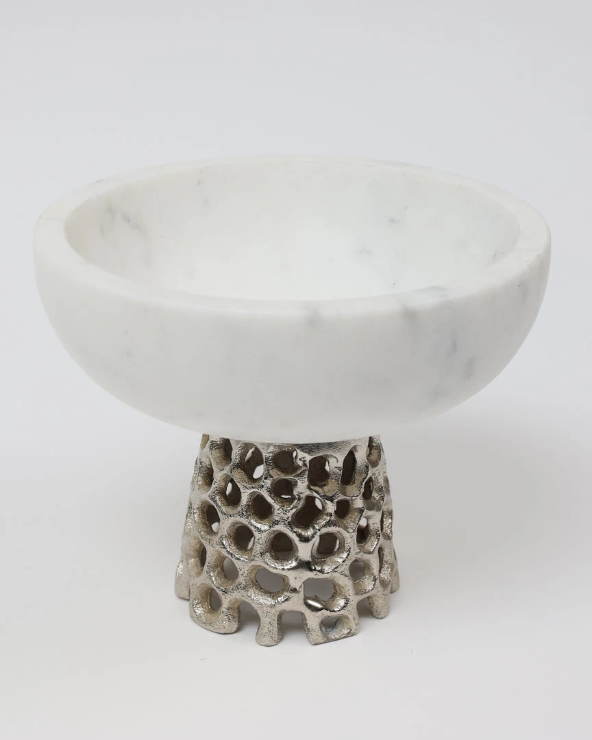 Description: This smaller-sized marble bowl with an intricate cutout design base will be perfect for serving snacks, as a match holder or placing your favorite smaller florals in!
