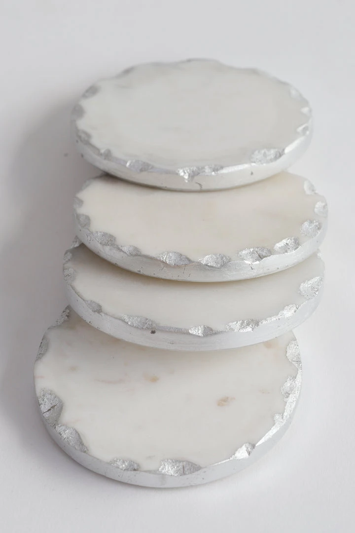 Description: These beautiful marble coasters are a perfect accent for your coffee table! Complete with a hammered texture edge and a metallic finish!