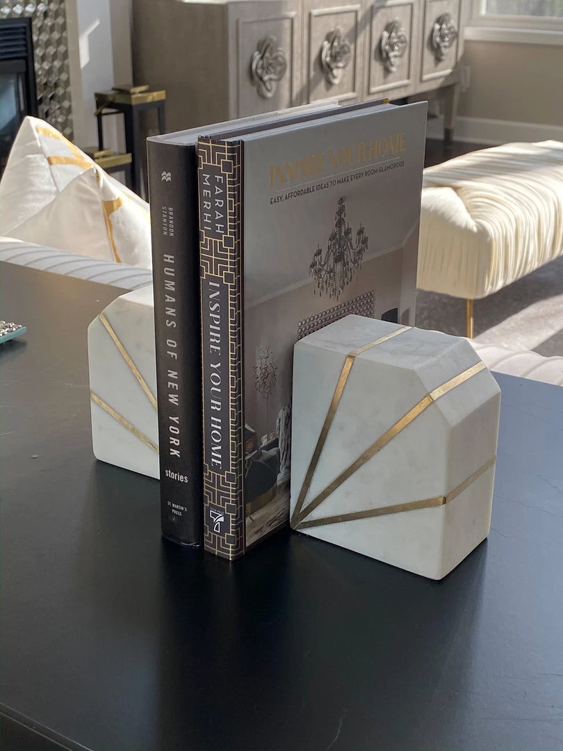 Description: Add some flair to your shelving with these stylist marble bookends! The white marble features geometric designs that add to the modern look, while still keeping it classic and elegant.