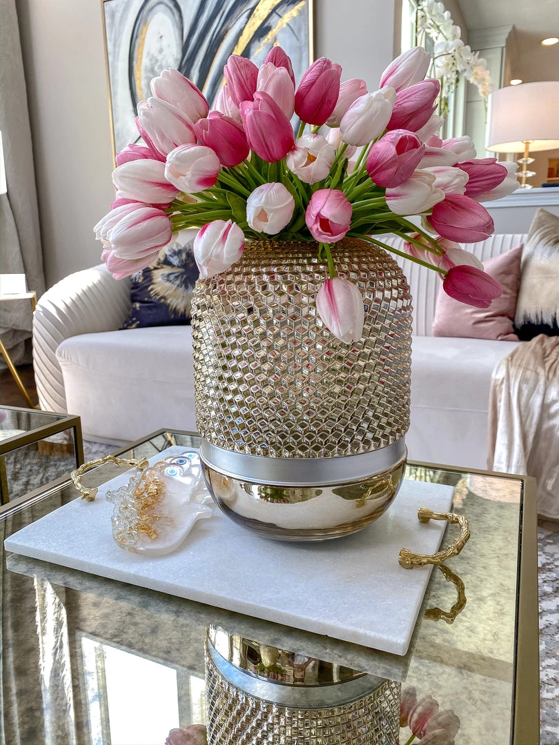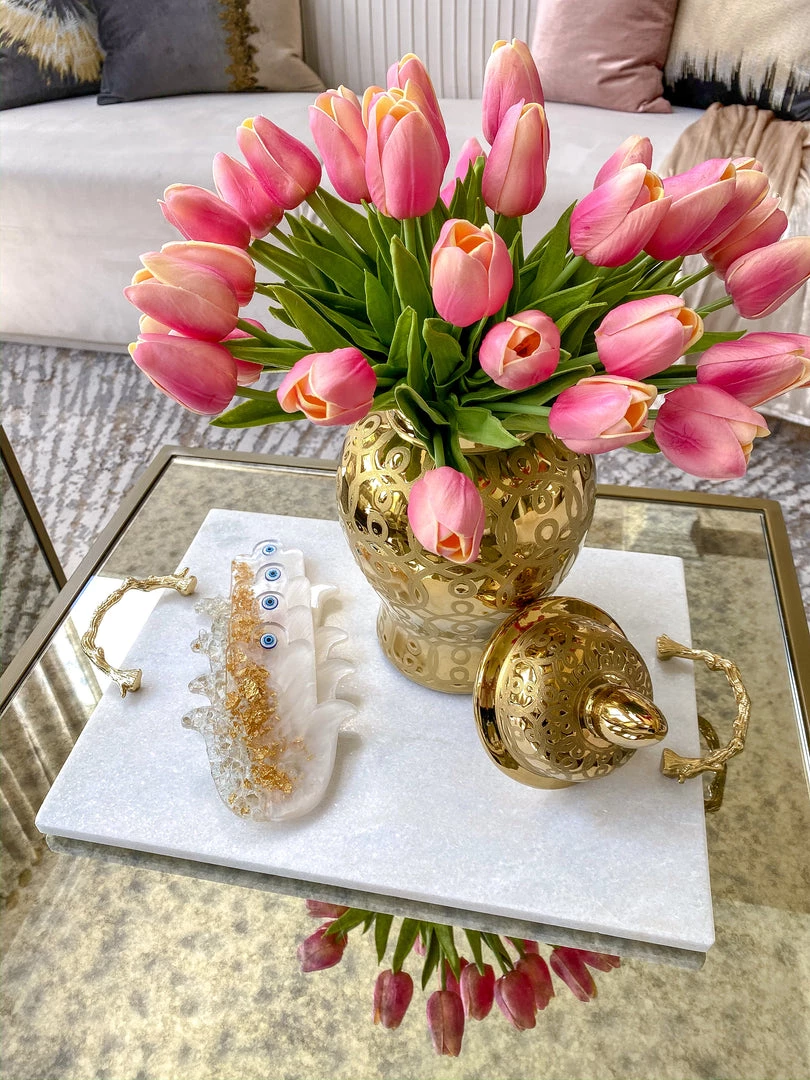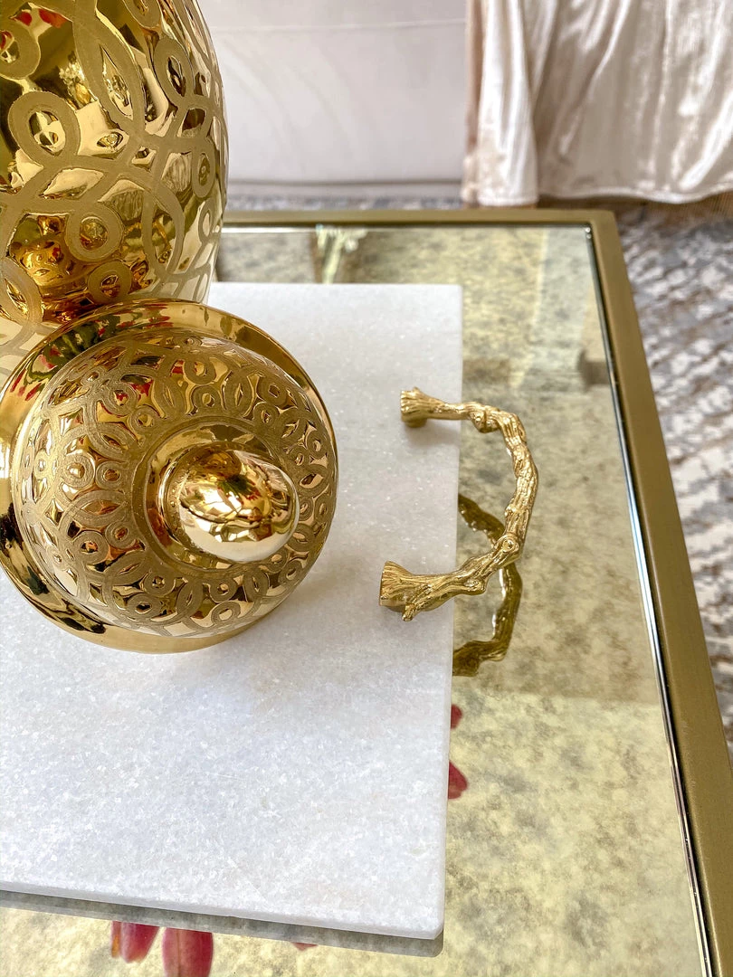 Description: This substantial marble tray features beautiful metal handles with a unique textured pattern.