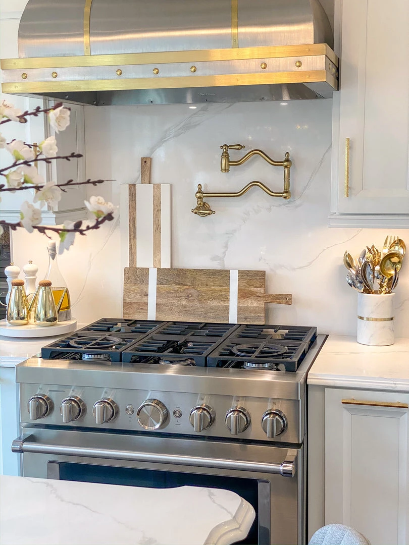 Description: This marble utensil holder features a gold band in the middle and we are head over heels! Place in your kitchen and fill with your favorite mixed metal servers for an elegant look.Â