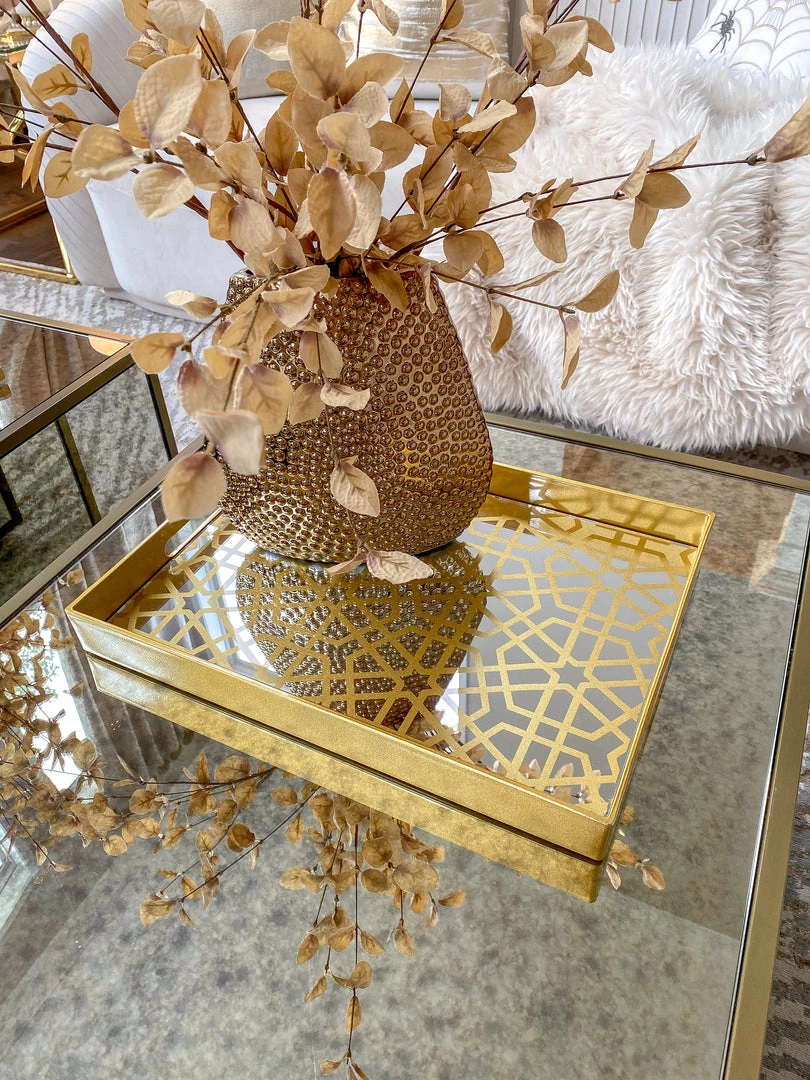 Description: These elegant trays featuring a mirrored glass design with a geometric gold pattern will add some glam to your home. Set of 2.