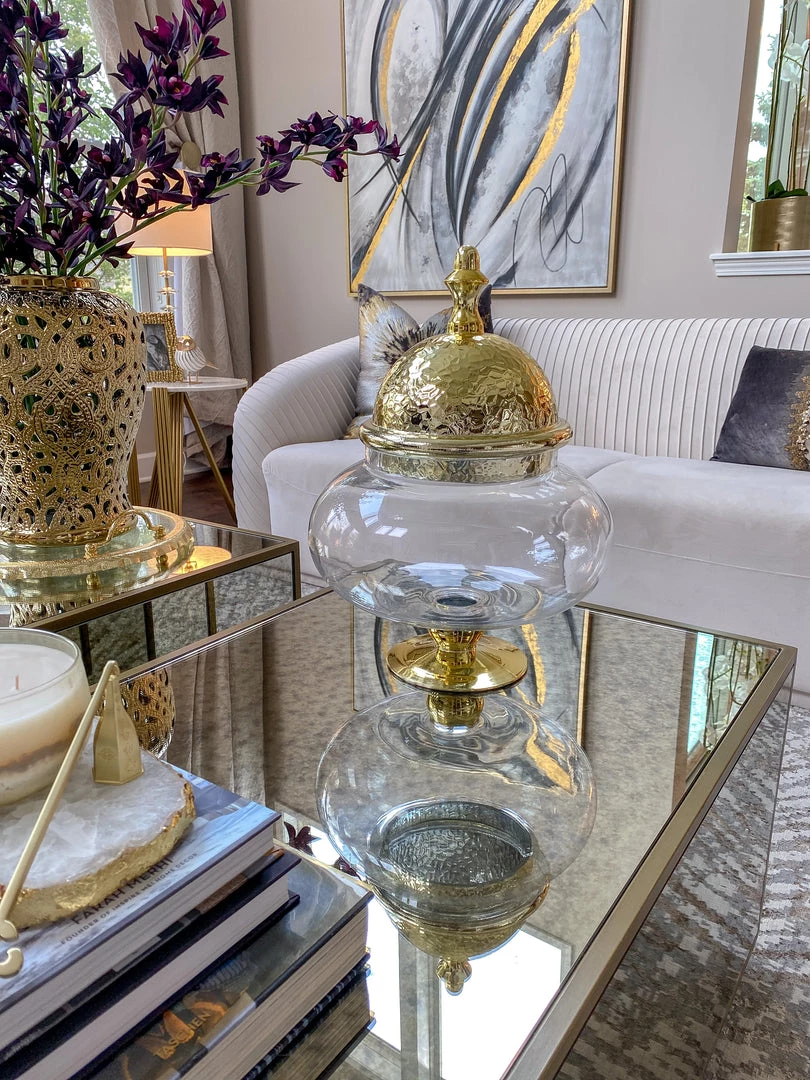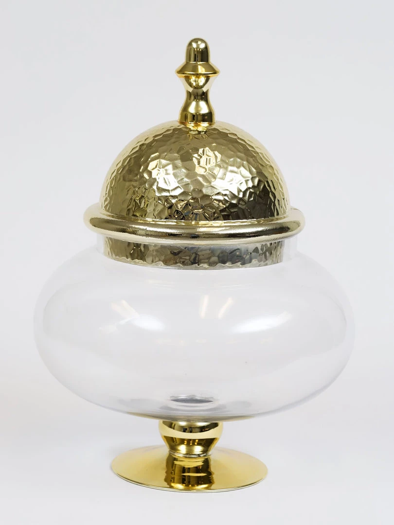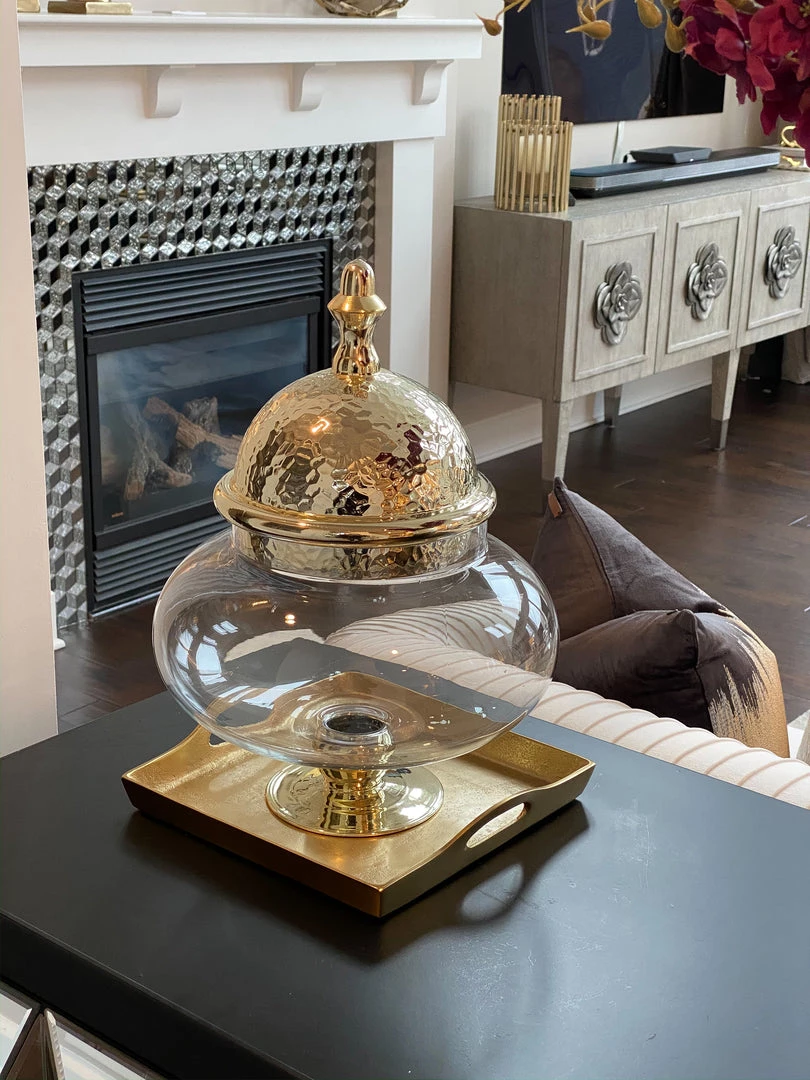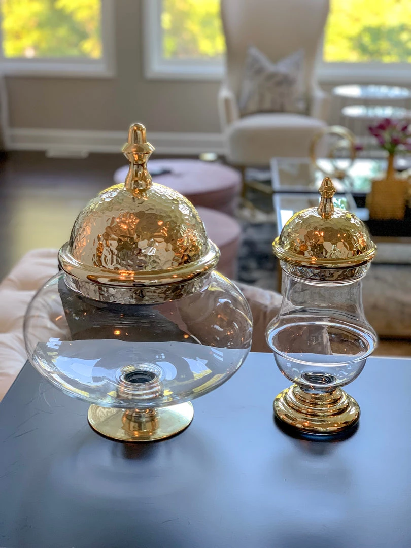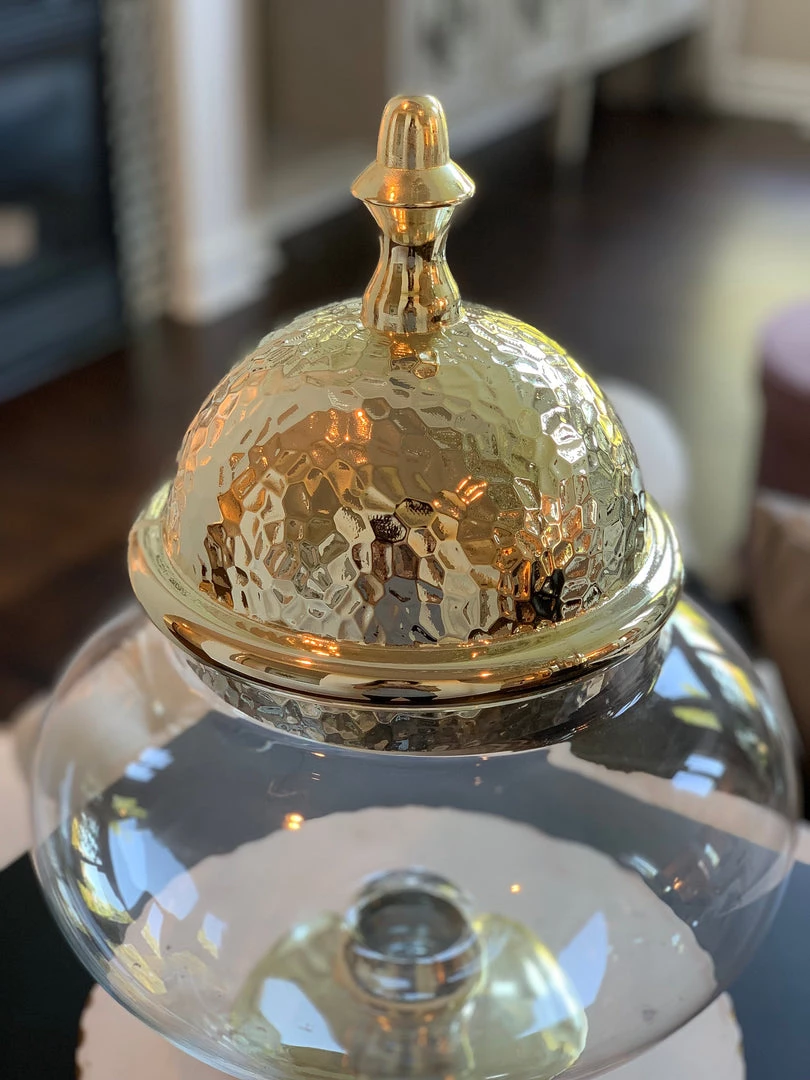 Pictured to the left is this beautiful over-sized Apothecary Jar with an elegant Gold Hammered Lid. Give your family room or any room the classic touch it’s desiring!Â