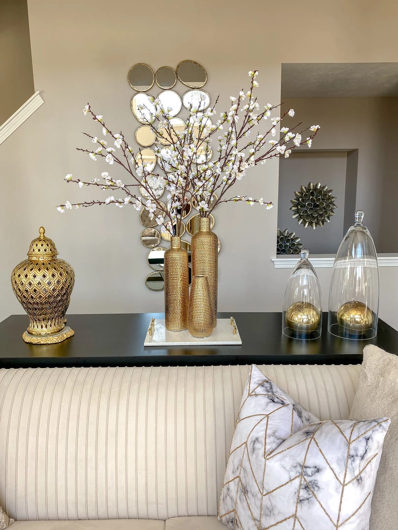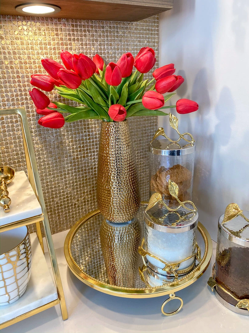 This polished hammered vase ties back perfectly to our polished gold hammered bottle neck vases and is a stunning piece when you add some faux florals. We love the hammered finish and how it ties together any room!
