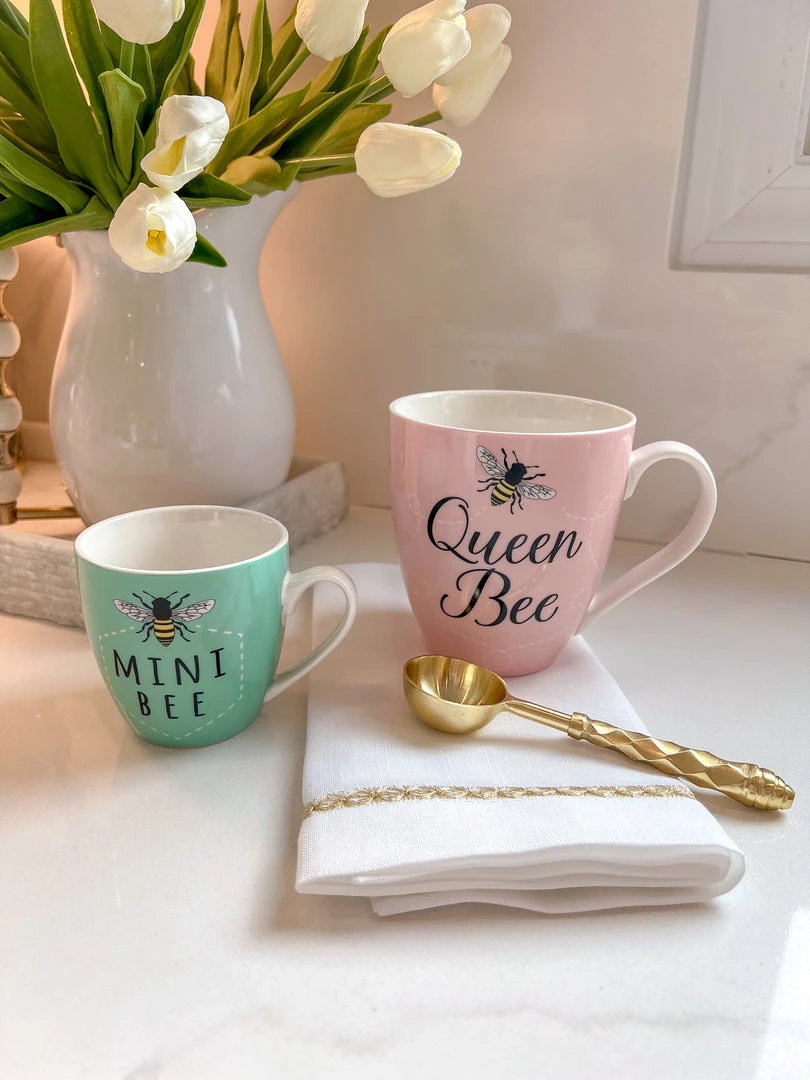 Description: This adorable mug gift set is perfect for new mothers and more. The 17 oz. mug reads: “Queen Bee” and the 7 oz. reads “Mini Bee” in mint with bee icons.