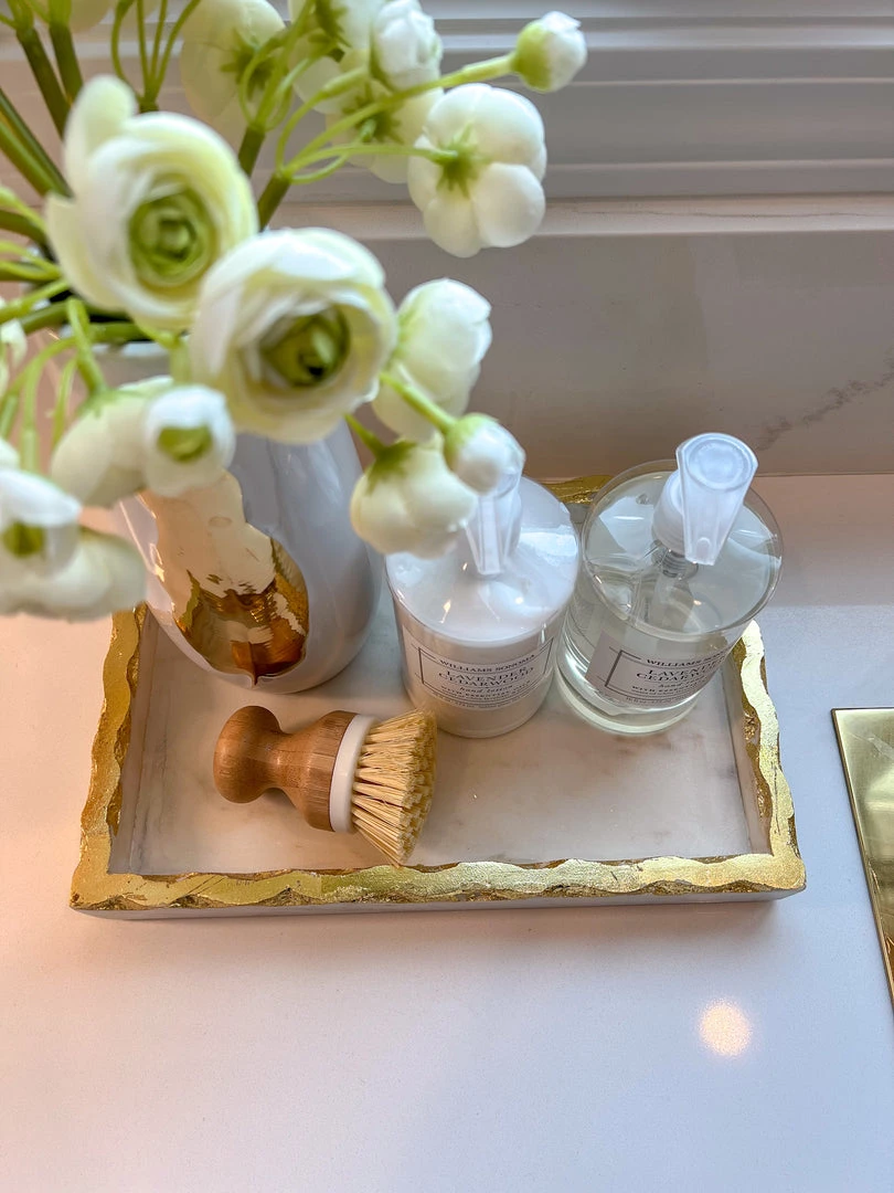 Description: This marble tray with gold trim has so many uses, place it at your sink for holding your lotions, soaps and scrubbers, or use it in your home decor!
