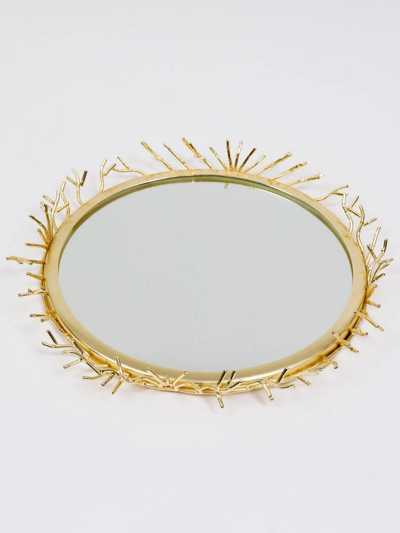 Description: This round mirrored tray features a fun textured gold border that will bring texture and glam to your decor! This is a great layering piece!