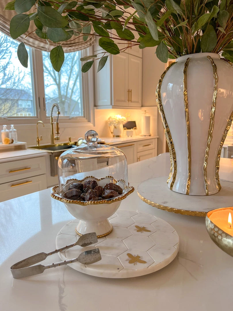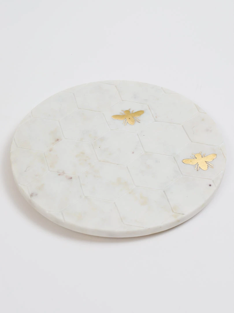 Description: This round marble platter features gold bee inlays and a hexagon pattern! We love the little details that make it so interesting!