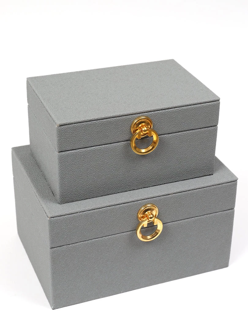 Description: We love the elegant look of the faux leather and the beautiful gold accents! Can be styled together, or separately, and they are great for storing things like remotes and other items.