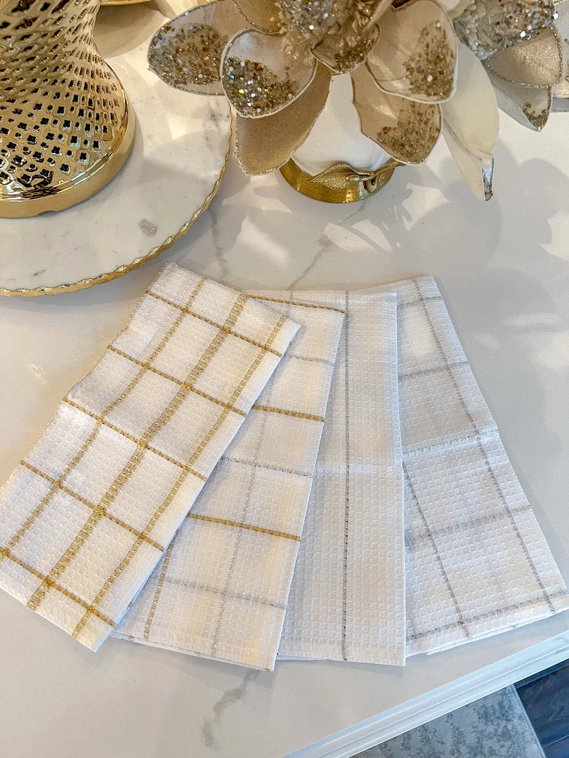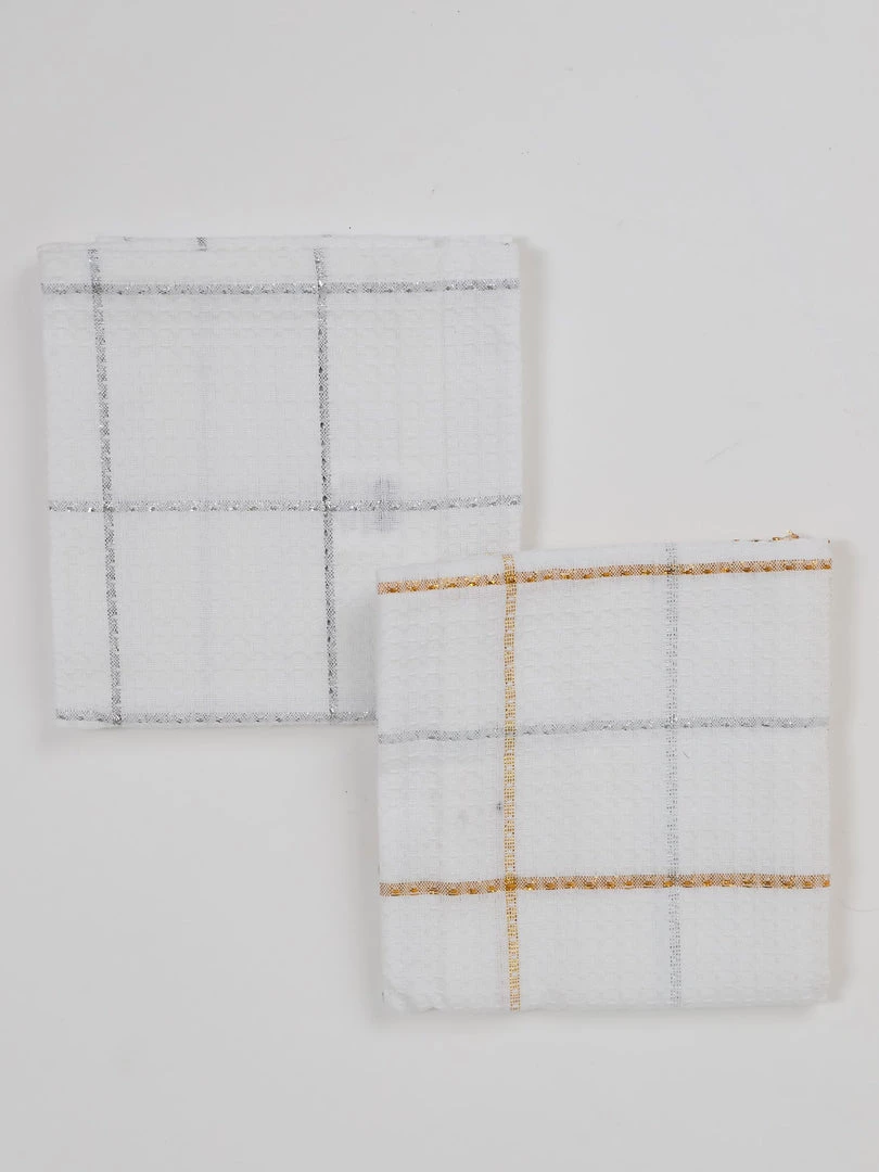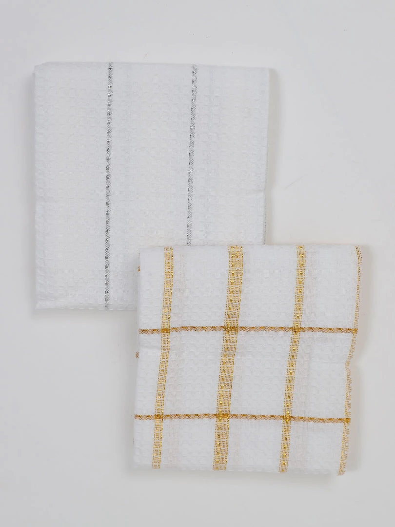 Description: Set of two waffle weave dishtowels with metallic plaid patterns.