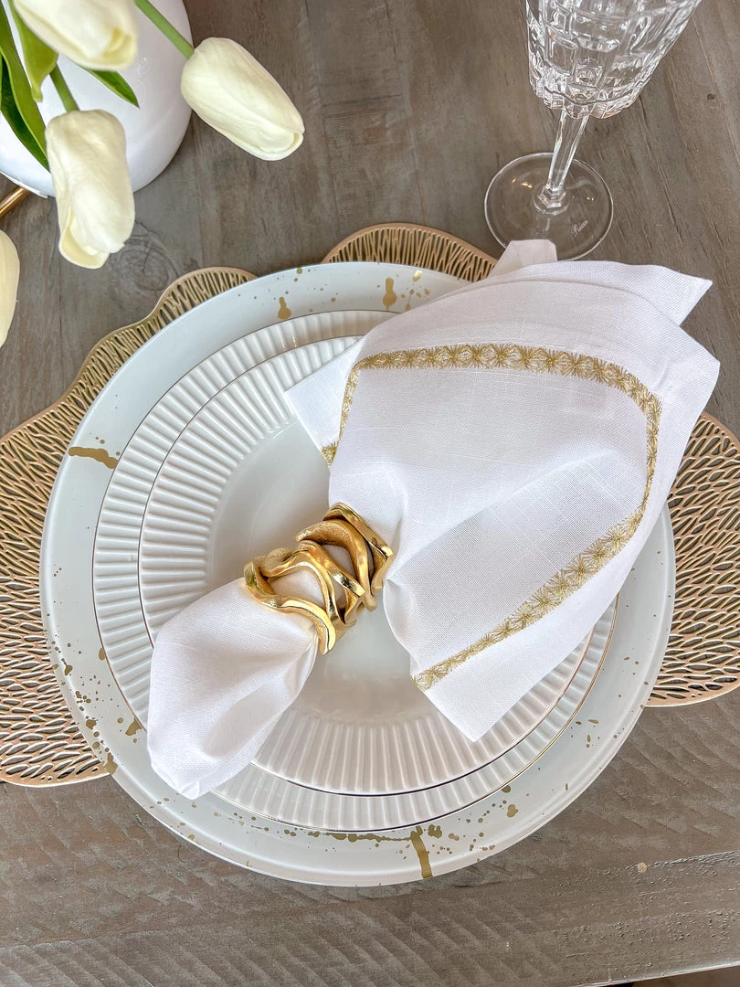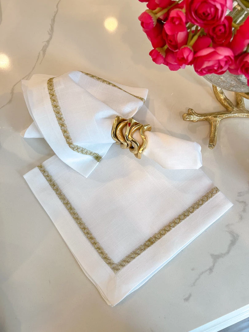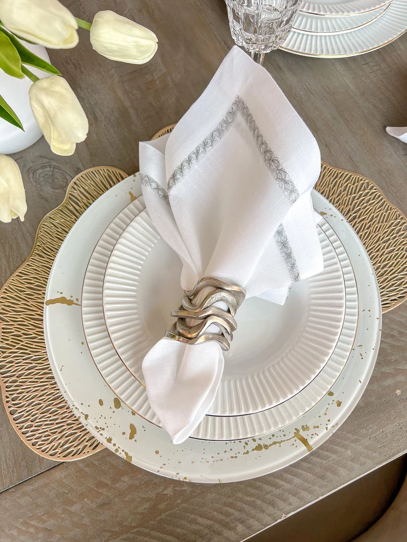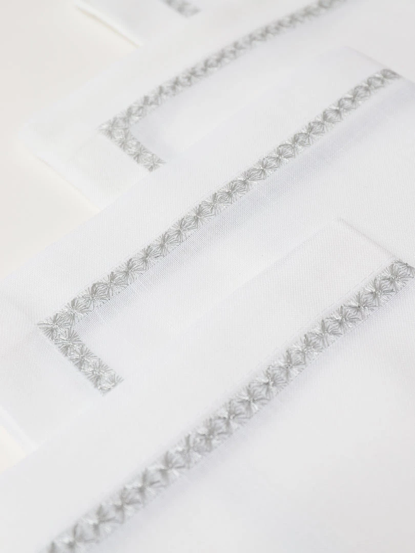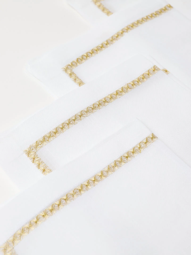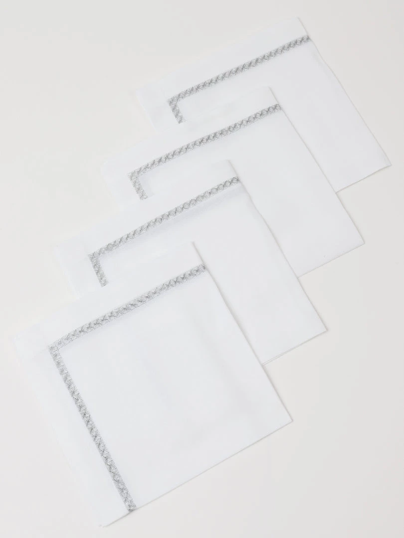 Description: This is a set of 4 beautiful square white napkins with embossed detailing.