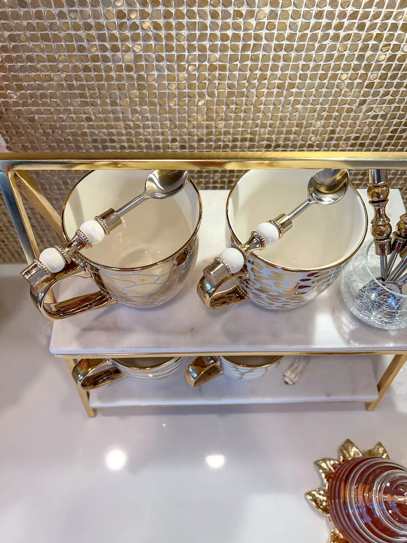 Description: These set of 4 tea spoons feature metallic beaded handles. They are perfect to style on your coffee station or to use to stir your coffee or tea!