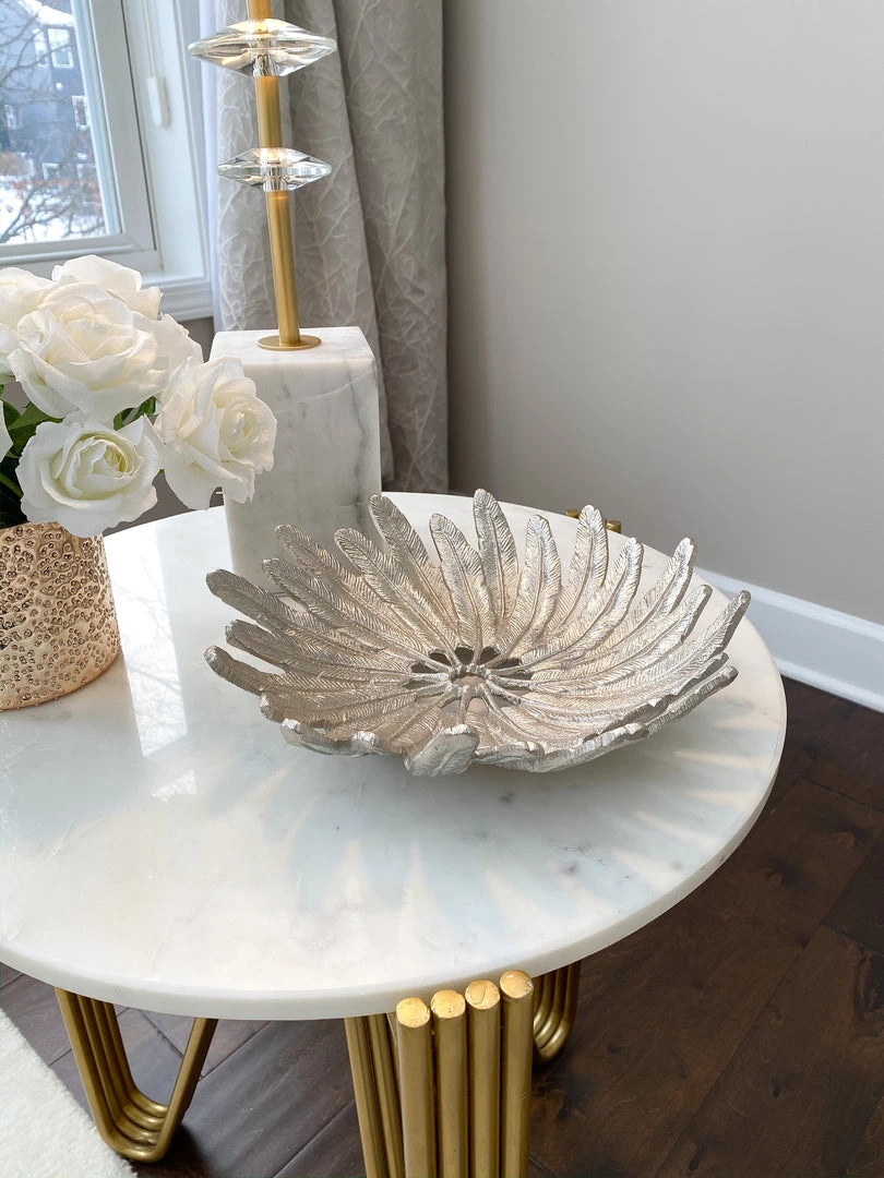 Description: This detailed flower plate is a beautiful base for your tabletop display! The textured petals spiral out from the center and create a wonderful eye catching design. Available in gold and silver!