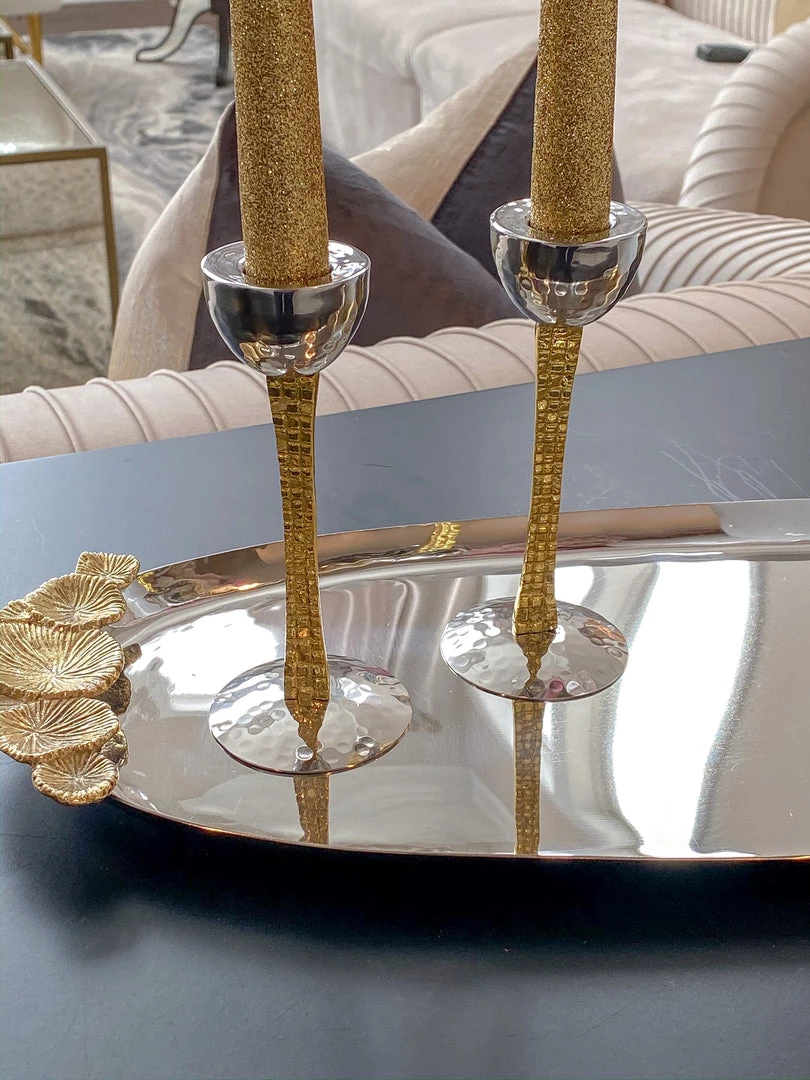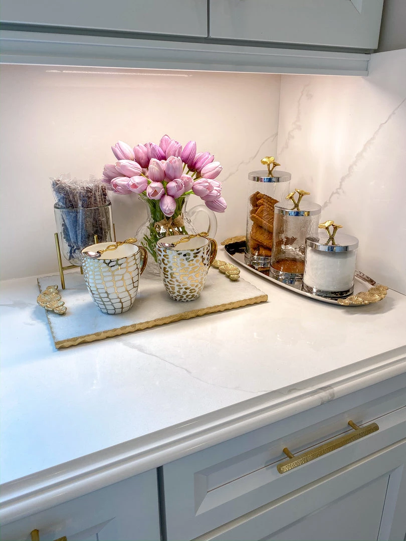 This stainless steel oval tray features gold floral handles and is a perfect home for your marble and gold hammered jars or your hammered lid glass jars.