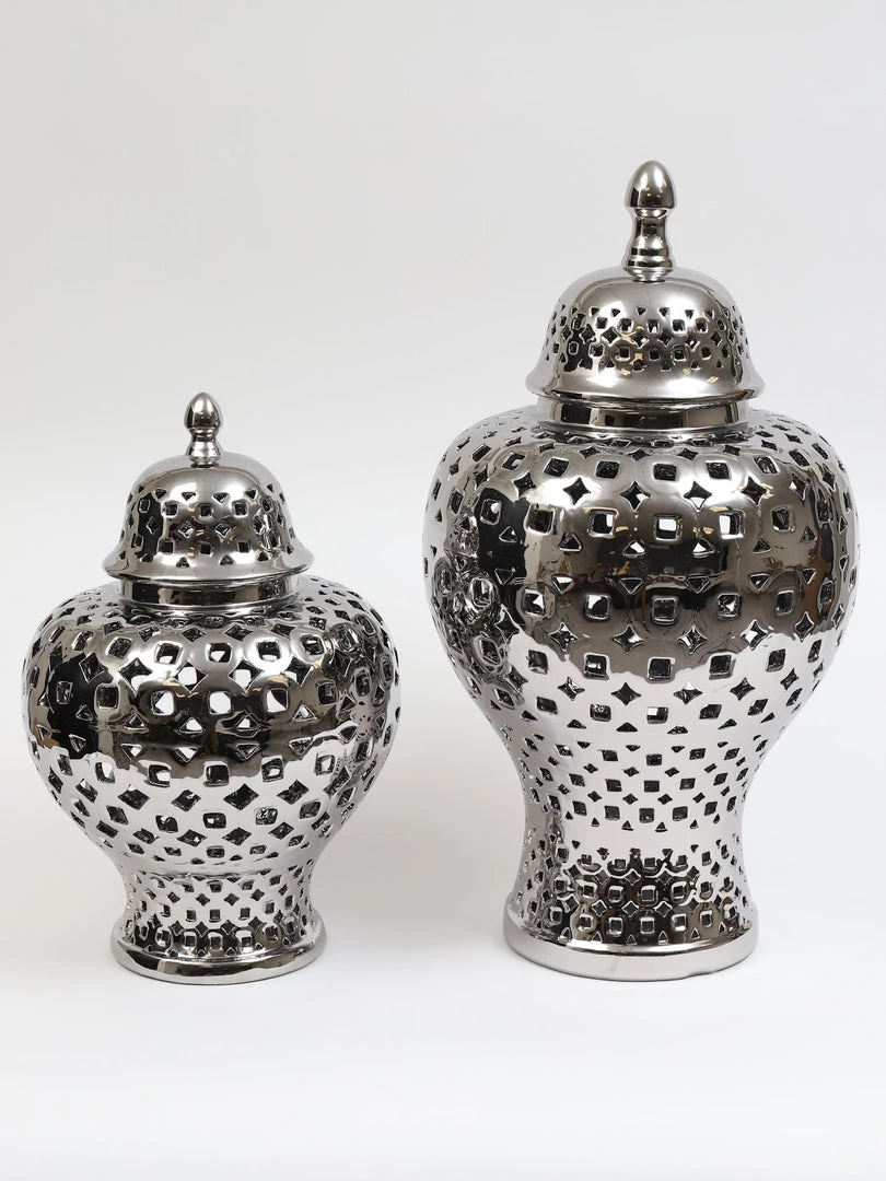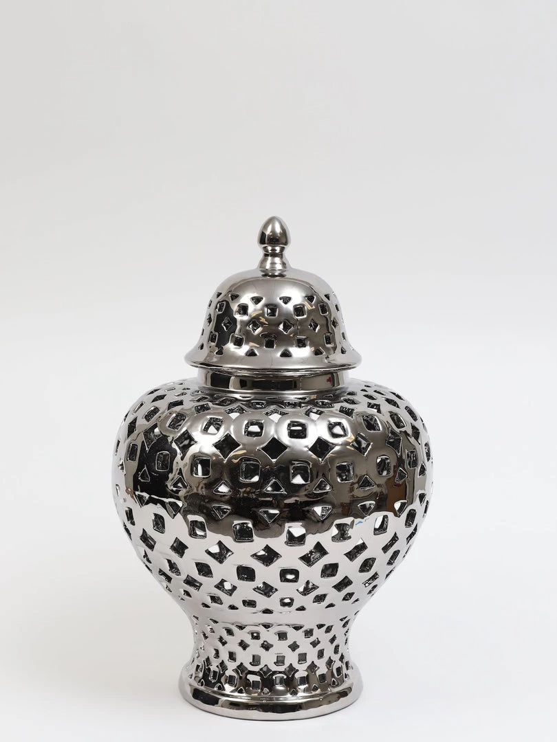 Description: This Silver pierced ginger jar will make a great addition to your home decor! Displayed with your favorite florals or on its own, either way, this piece will make a dynamic centerpiece!