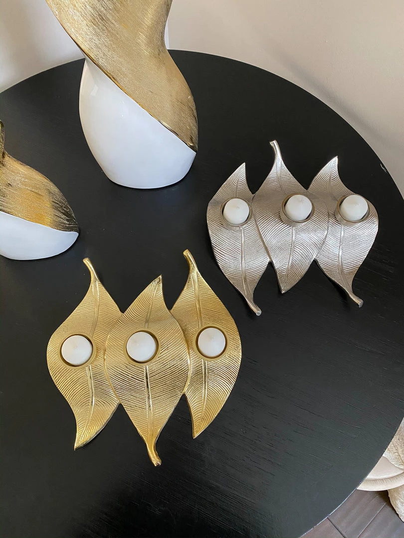 Description: This triple leaf tealight holder comes in silver and gold and can be used almost anywhere in your home. Use it as a centerpiece, on a coffee table, or anywhere else you can think of. We love the texture and detail in this piece.