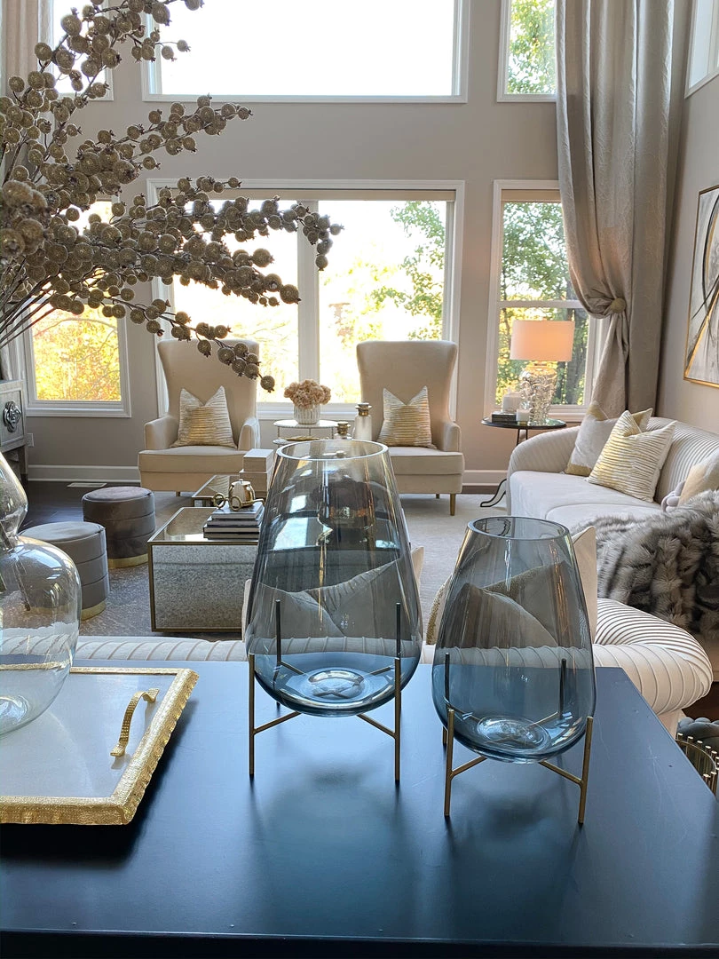 Description: These smoke colored vases sit on gold stands and can be filled with faux florals, or can be used and planters for a fun and mondern look! Come in two different sizes sold separately.
