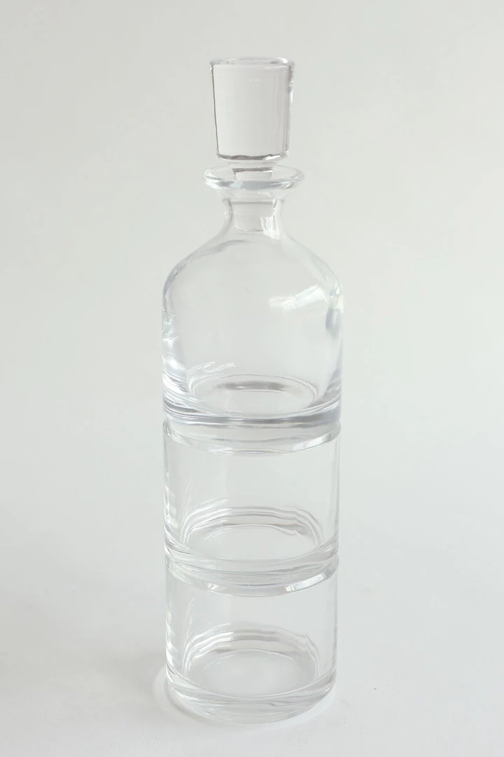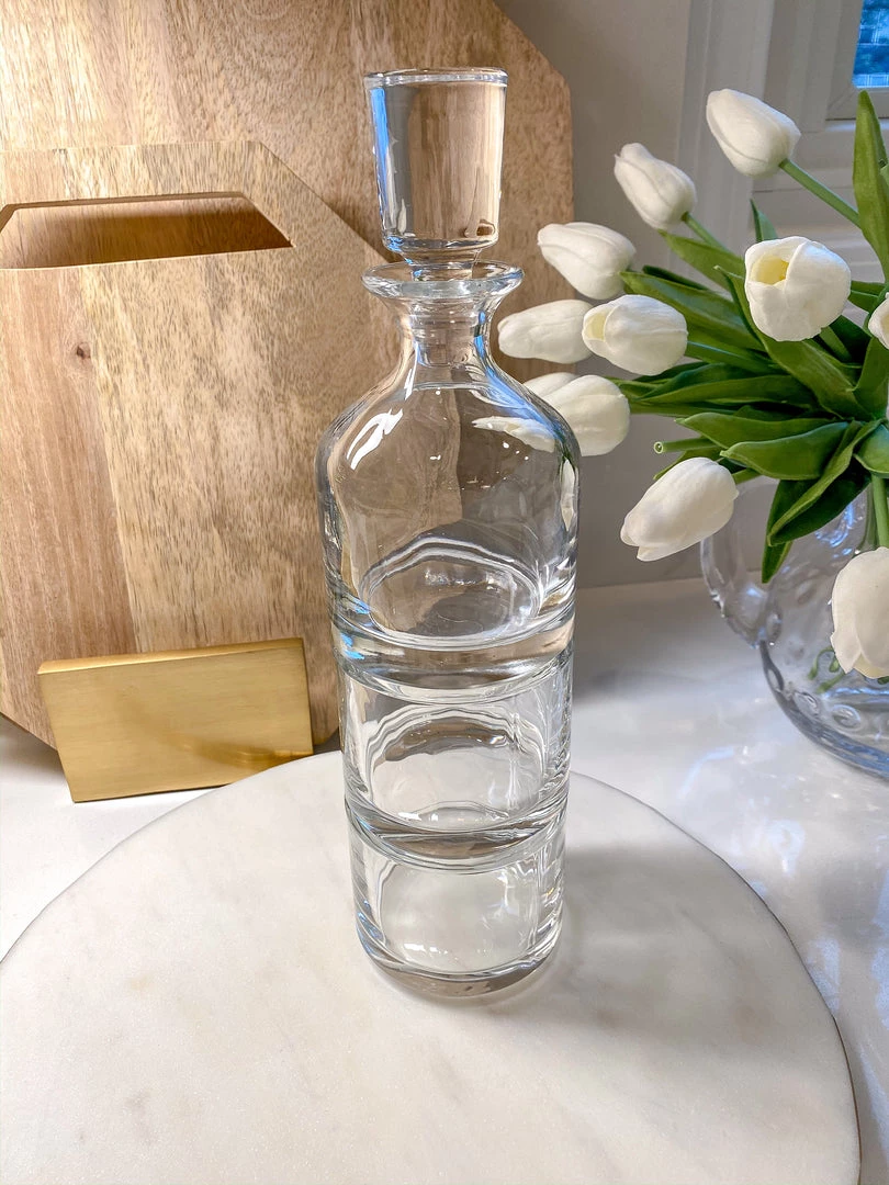 Description: This beautiful glass decanter is a truly unique piece! The decanter is stackable and comes with 2 additional cups! It makes for easy storage and a beautiful design!