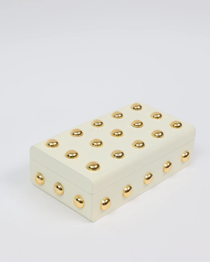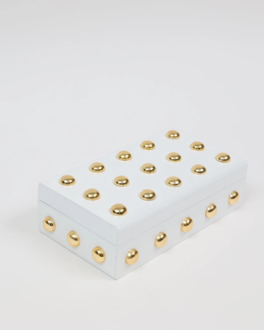 Description: This wooden box with its shiny gold studs is a statement maker.