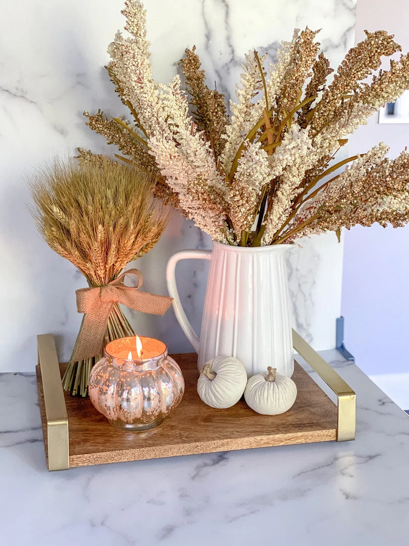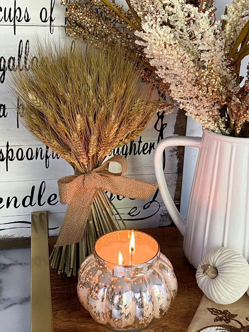 This tied, dried wheat bundle screams fall! It is such a perfect addition to your fall vignettes on your console, or in your centerpiece.