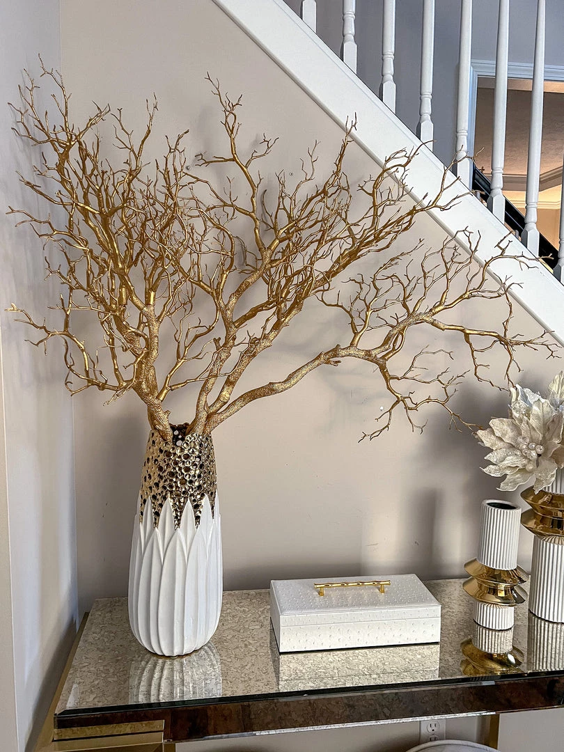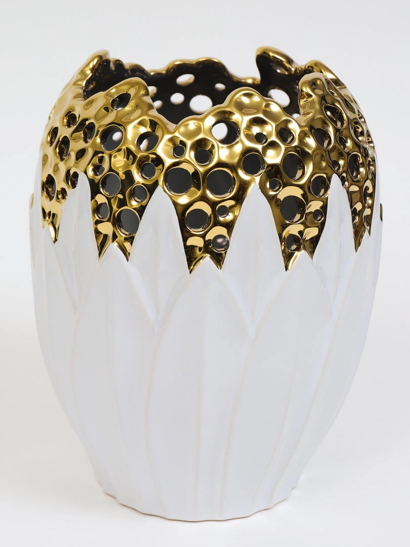 Description: This white and gold vase is stunning! We love the gold and white look as well as the open work design!Â