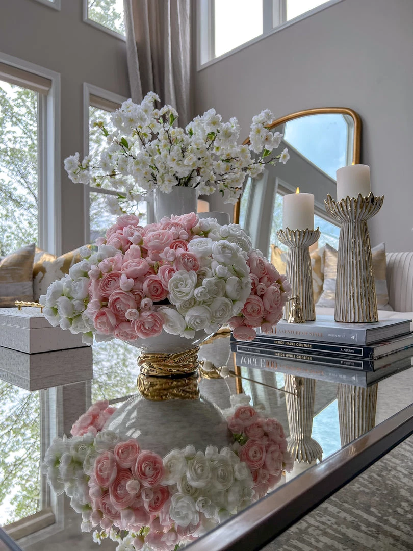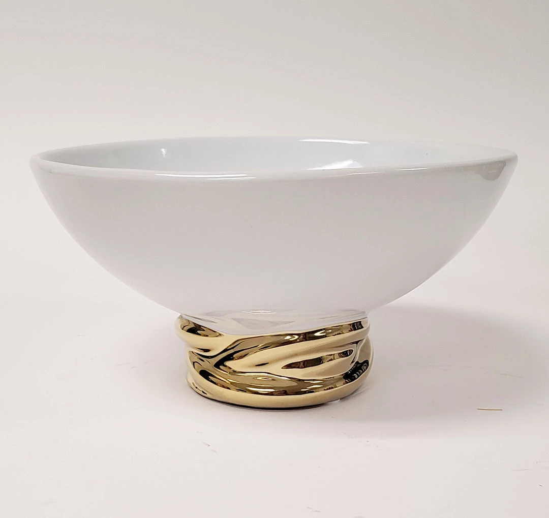 Description: This is a gorgeous small bowl has an elegant gold braided design base that matches back to our white vases with elegant gold details.
