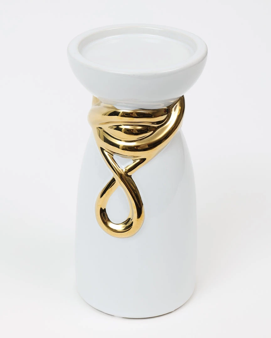 Description: This white and gold candle holder has a beautiful and unique style! These match well with our White Ceramic Jar with Elegant Gold Details, our White Bowl with Elegant Gold Details and the White Ceramic Vases with Elegant Gold Details.