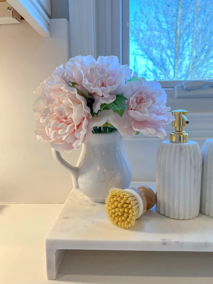 Description: This is a beautiful ceramic pitcher filled with faux pink peonies.