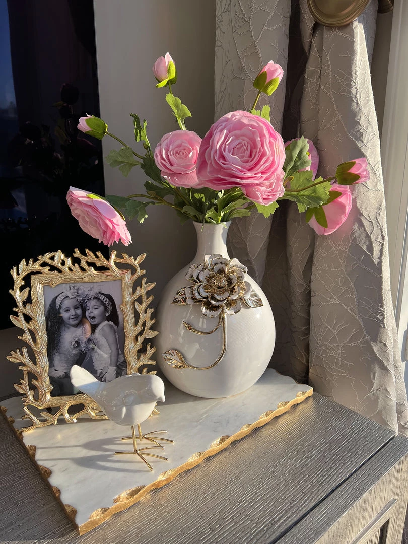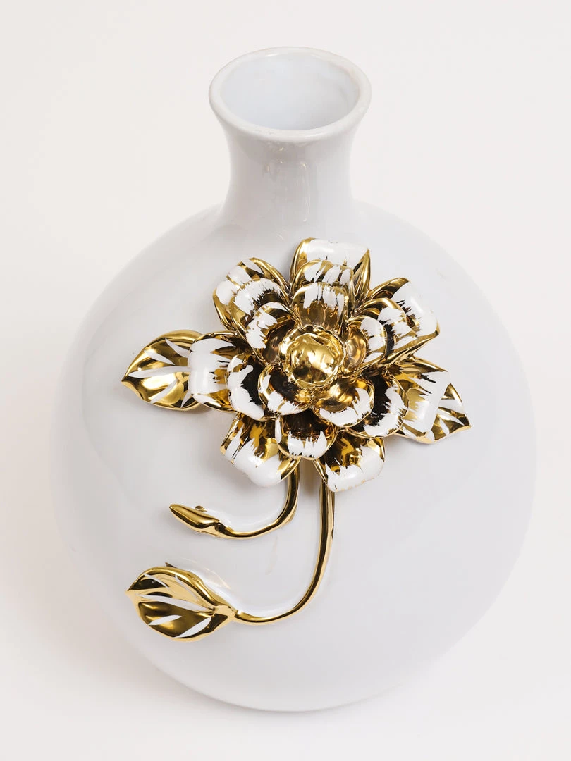 Description: This vase features a stunningly intricate gold floral design that is so unique! What a perfect way to style your favorite floral arrangement!