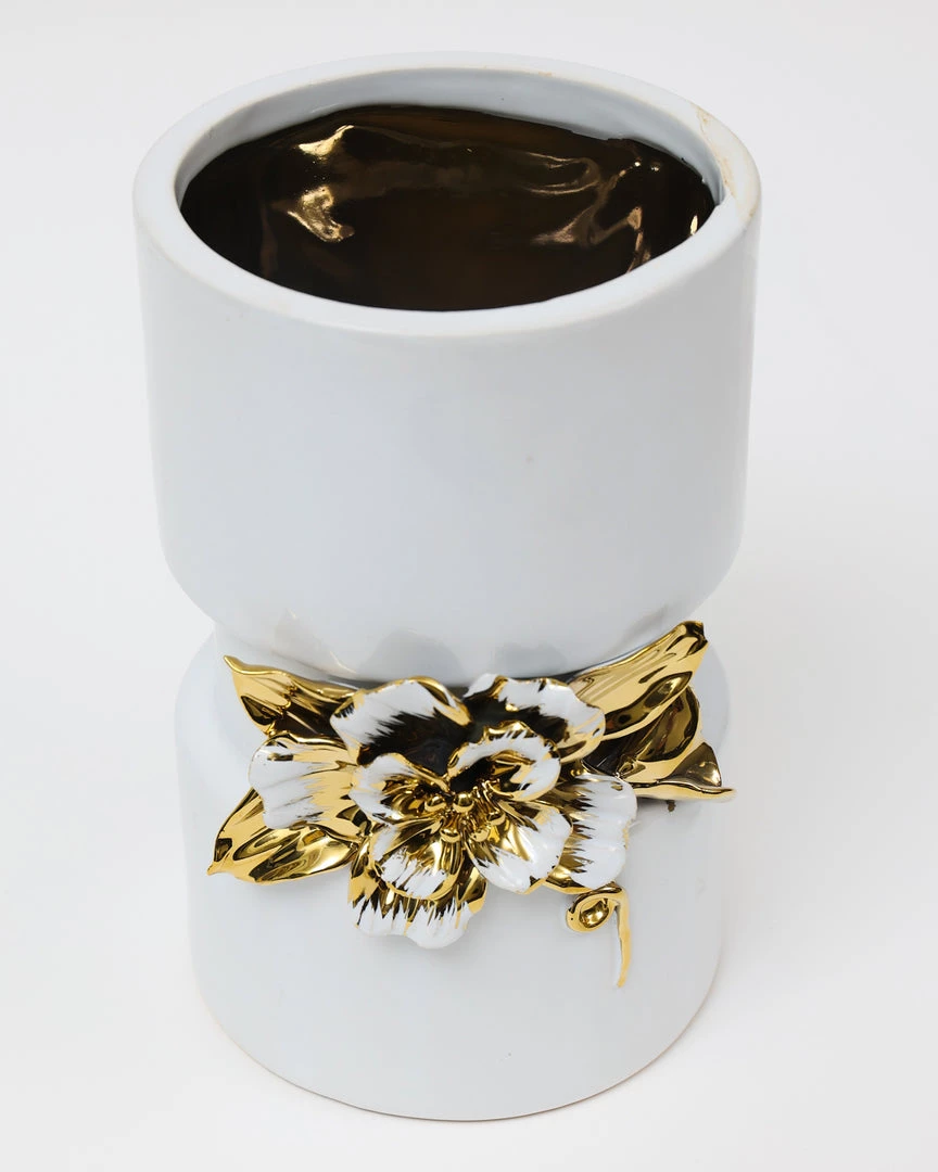 Description: This is a must-have item! The white ceramic vase is enhanced by the bold 3D gold and white floral design!