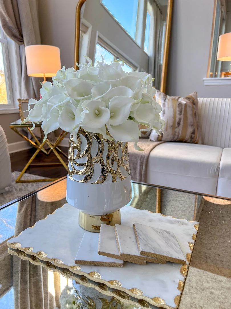Description: This white ceramic vase with its gold circle design is sure to stand out!