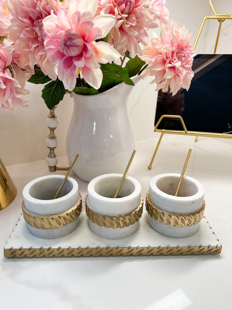 Description: This marble 3 bowl and tray set is perfect to display your favorite spices! It will take your serveware to the next level.