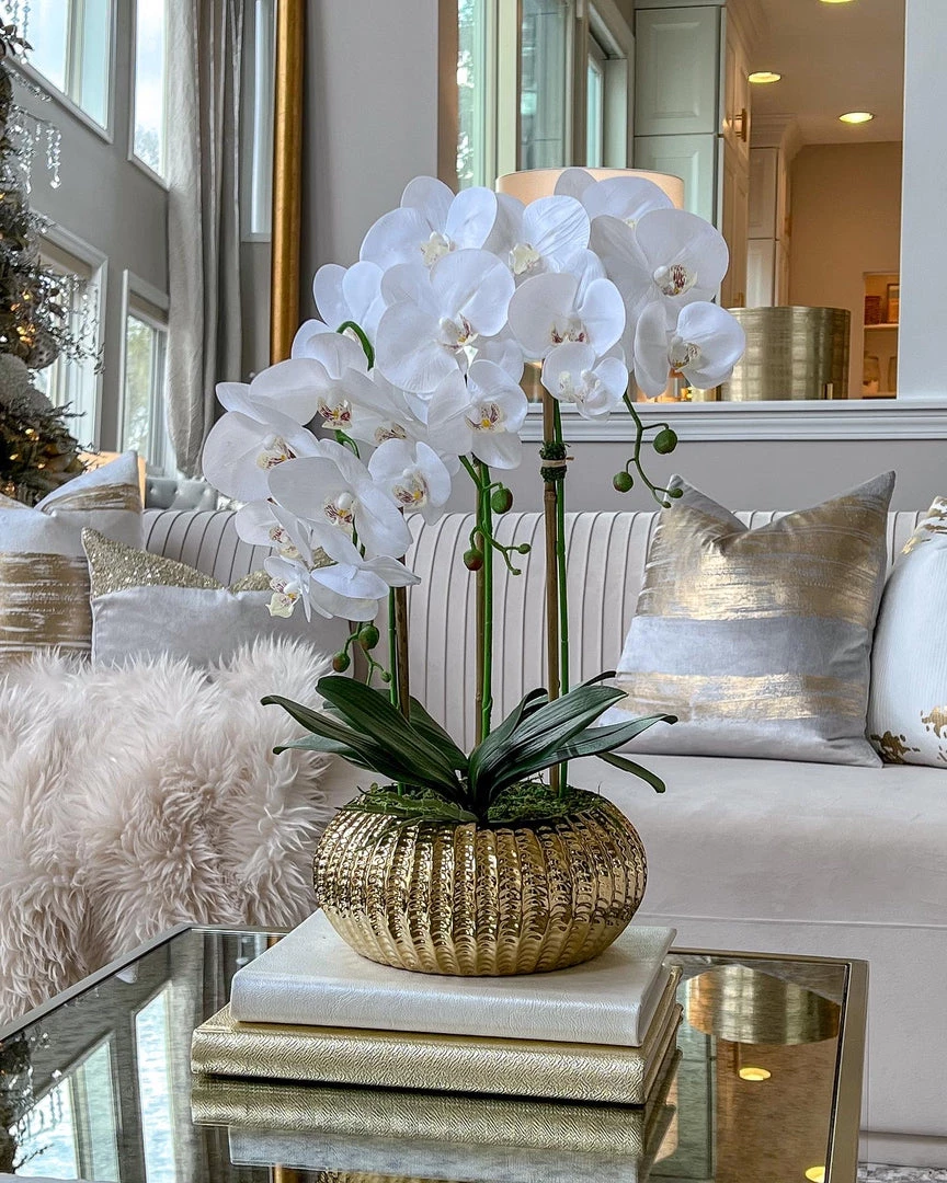 Description: This white potted faux Orchid is beautiful! The gold circle pot is perfect to match the rest of your home’s decor. Place anywhere in your home to display.