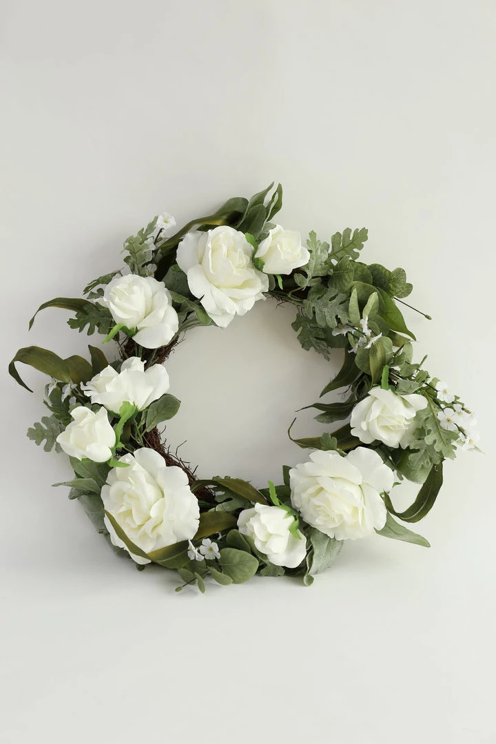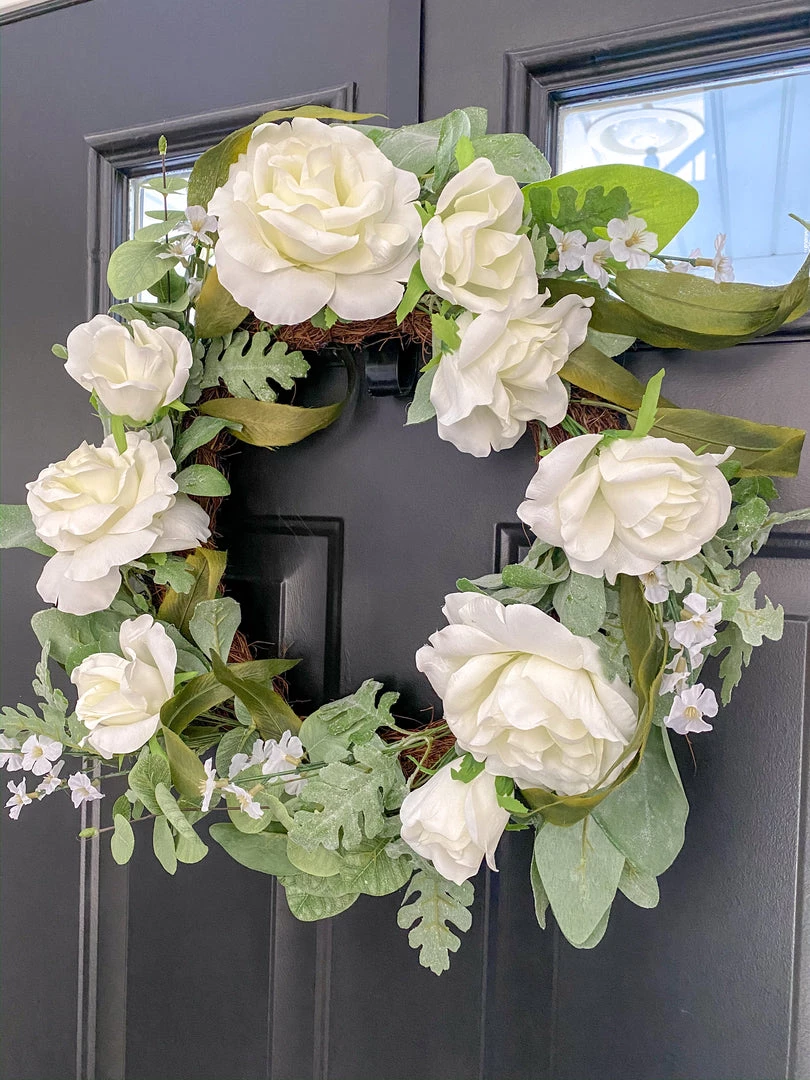 Description: This faux floral wreath features white roses and eucalyptus leaves and is so fresh and inviting! We love it styled on a front door!