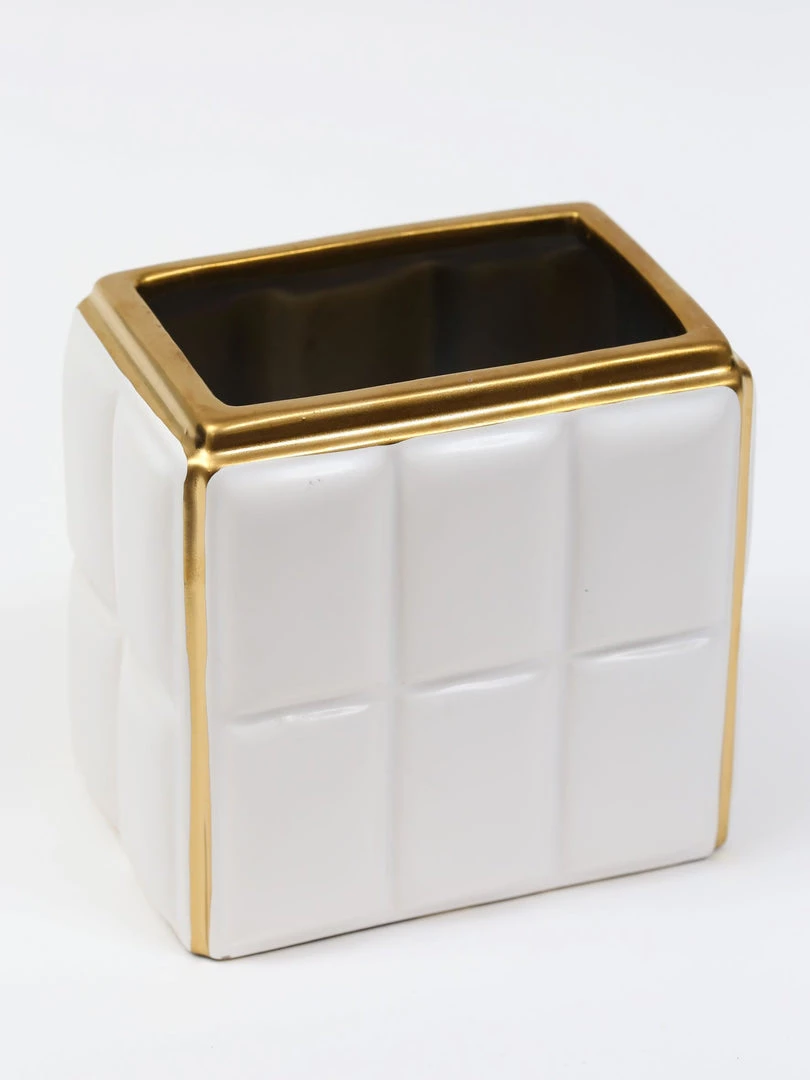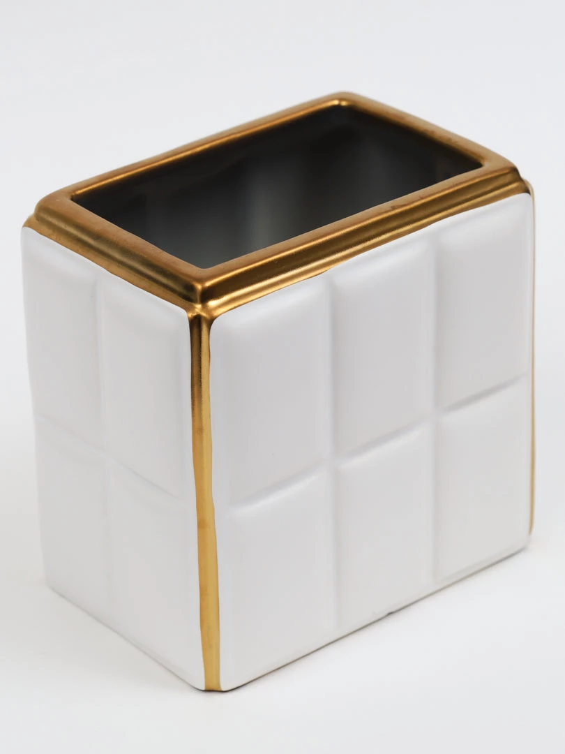 Description: This small vase is perfect for storing your utensils or displaying your favorite faux florals. The white and gold quilted design will fit perfectly with any decor!