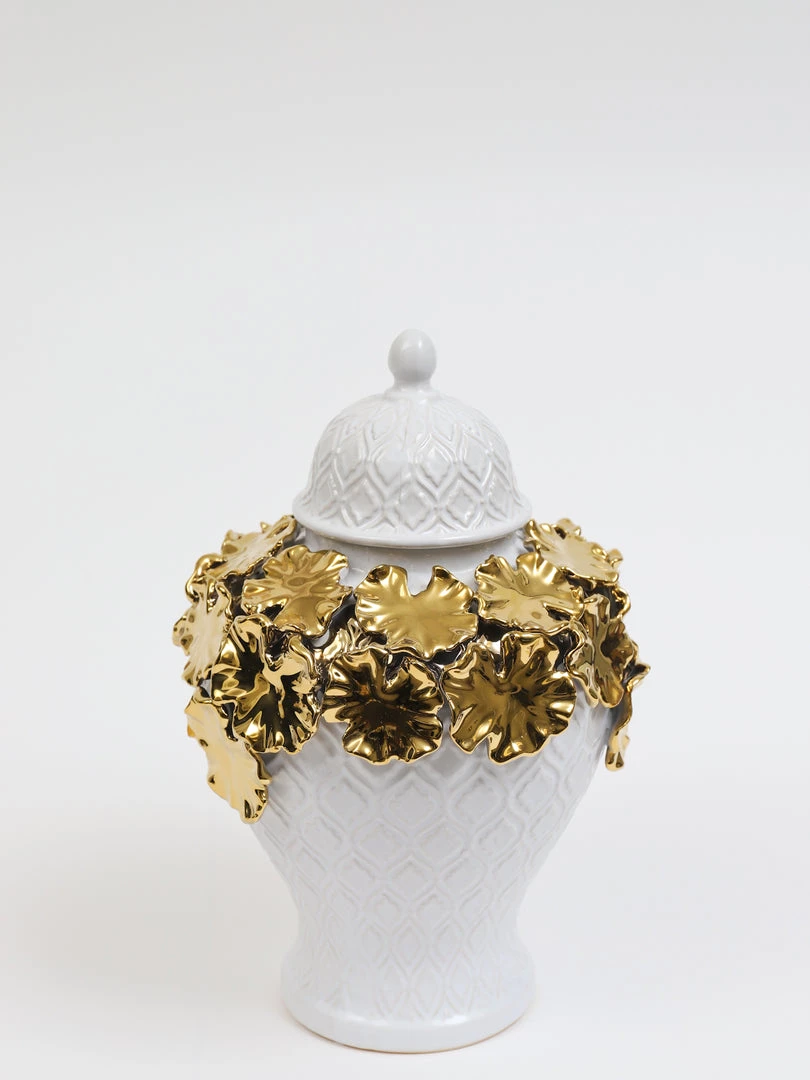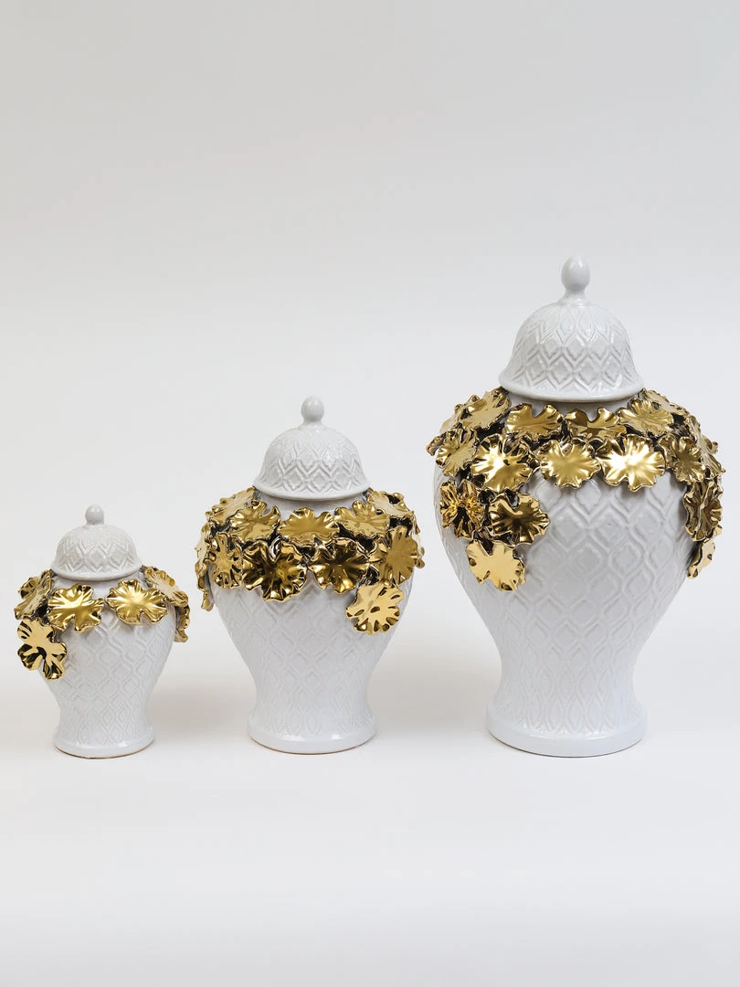 Description: These white textured ginger jars with their gold floral details are simply stunning!