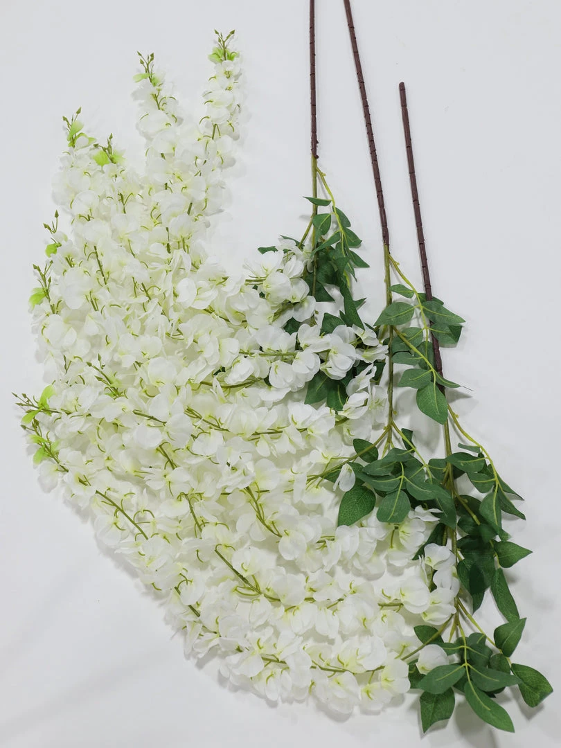 Description: This white wisteria stem is perfect for a large vase with some dazzling florals! The cascading blossoms and delicate leaves will look elegant and beautiful in any room of your home!