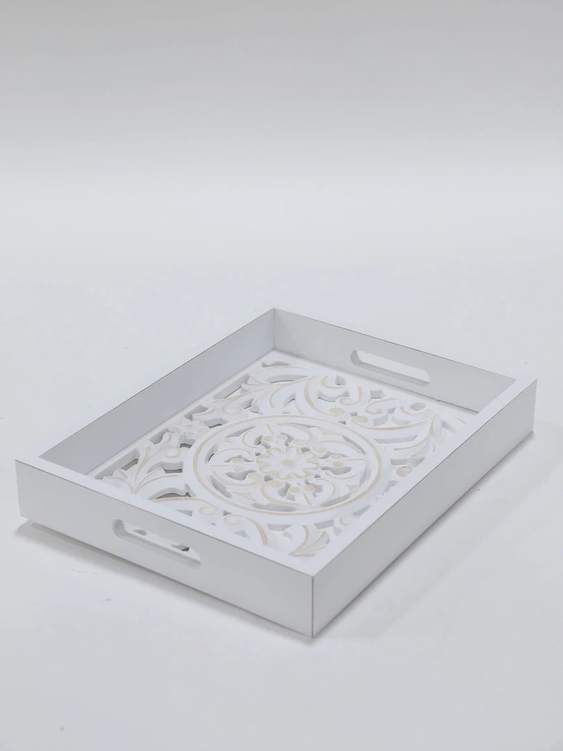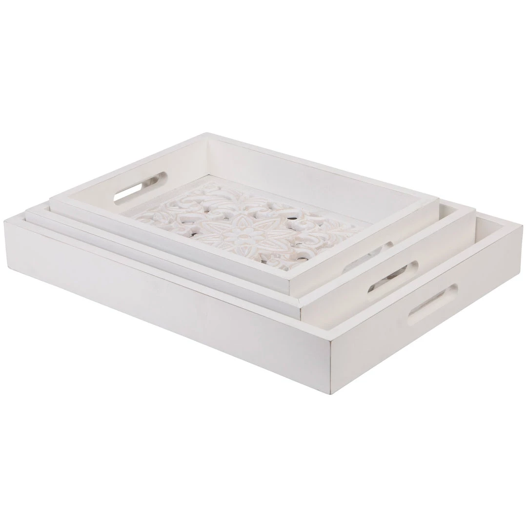 Description: We love these wood trays! This set of 3 trays features a unique abstract cut out design with stunning details!