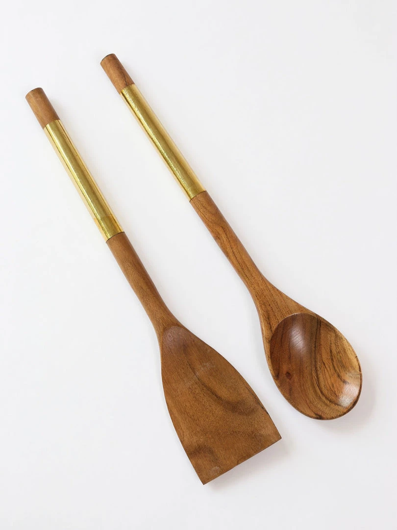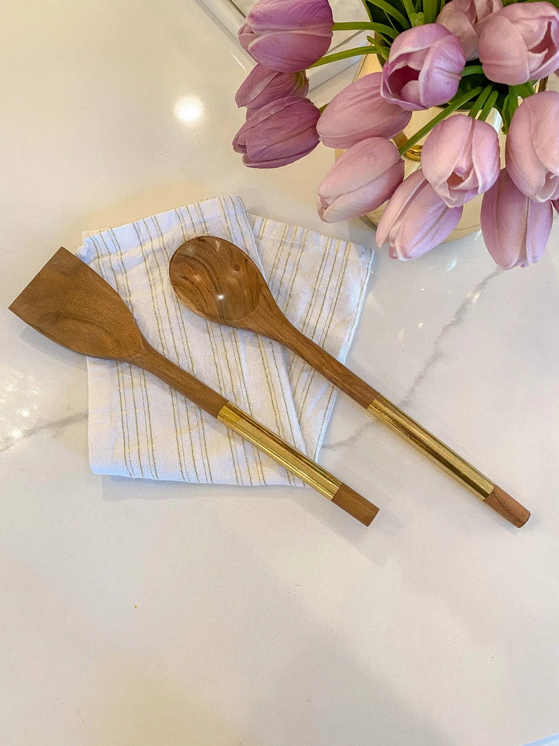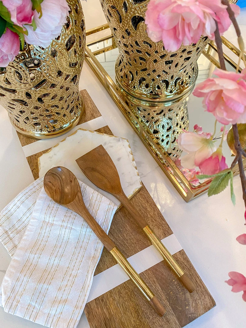 Description: These beautiful wood servers feature gold metal handles to add stunning sophistication to your serving sets!